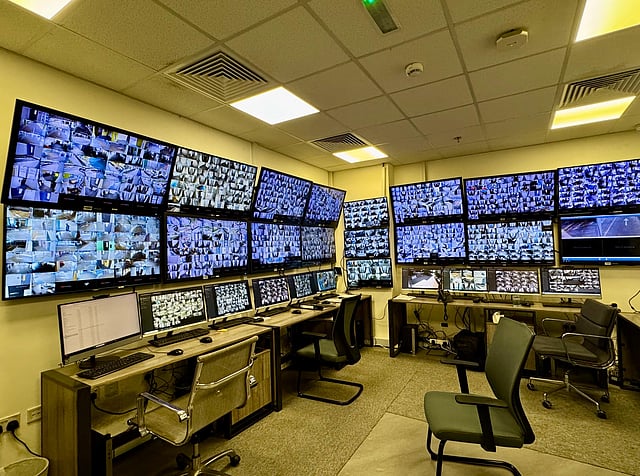 Two security guards oversee surveillance of various areas from the control room while other security personnel are stationed at different spots to control visitor access and manage emergencies.